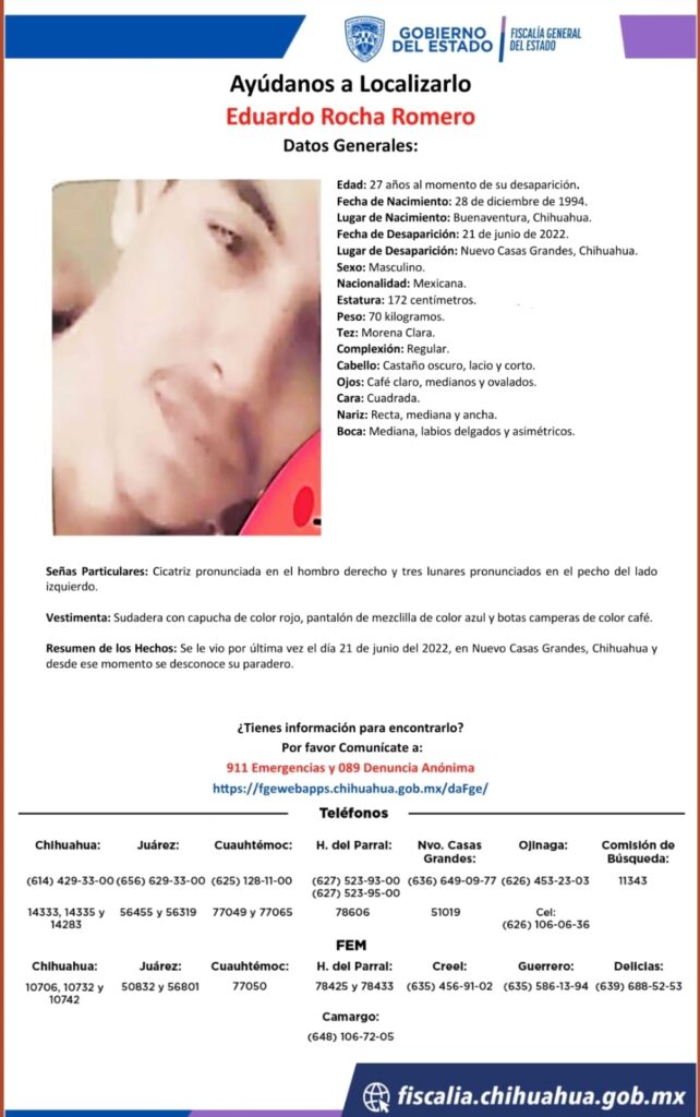 Eduardo Rocha Romero, de 27 años, desapareció en Nuevo Casas Grandes, Chihuahua, el 21 de junio de 2022. Se solicita información para su localización.