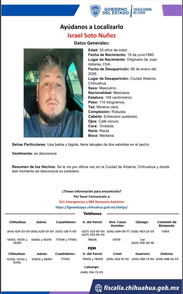 Israel Soto Núñez, de 35 años, desapareció el 6 de enero de 2026 en Ciudad Aldama, Chihuahua. Se solicita información para su localización.