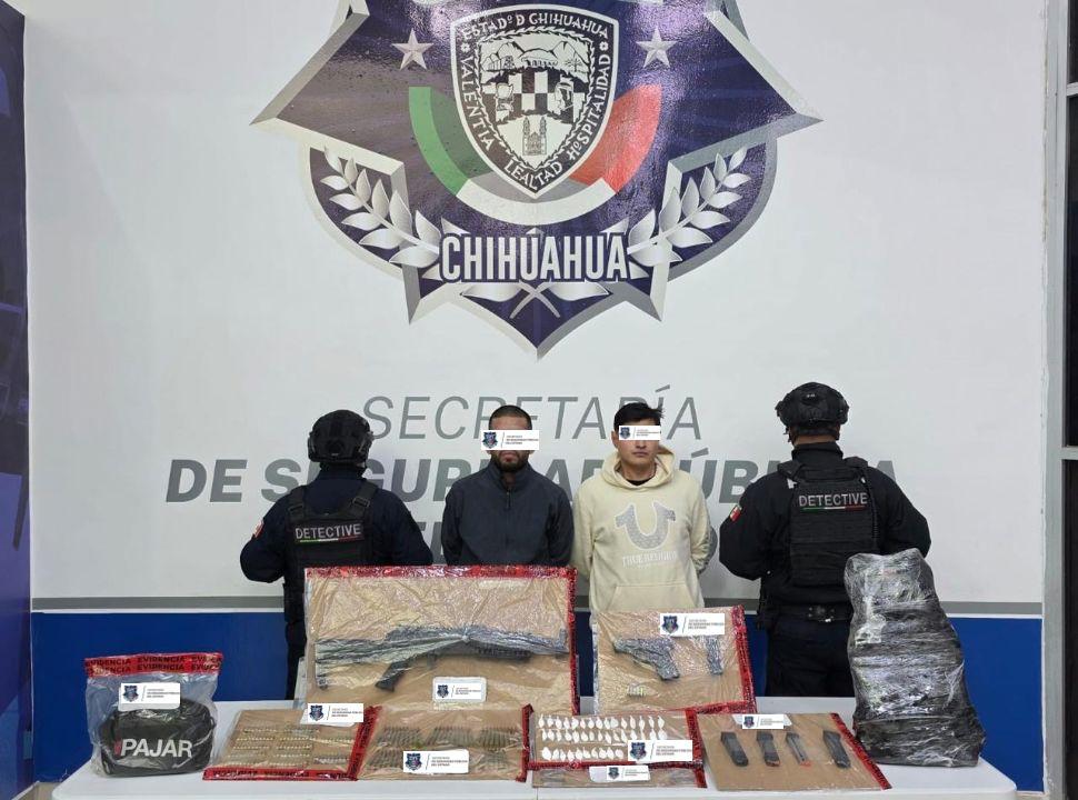 La Secretaría de Seguridad Pública del Estado detuvo a dos personas en Ciudad Juárez tras un reporte de detonaciones. Se aseguraron armas, droga y vehículos en la intervención.