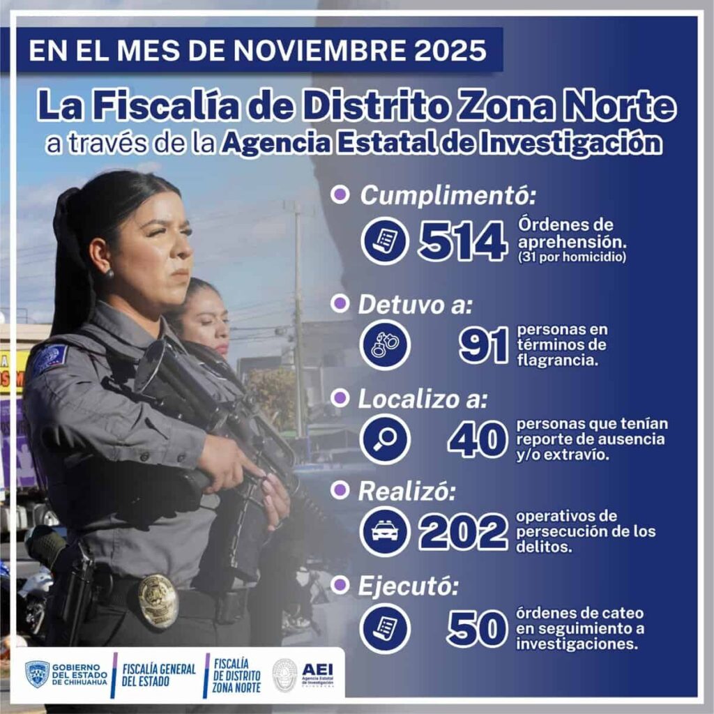 La Fiscalía de Distrito Zona Norte informa sobre la detención de 514 personas con órdenes de aprehensión en noviembre de 2025, incluyendo 31 por homicidio.