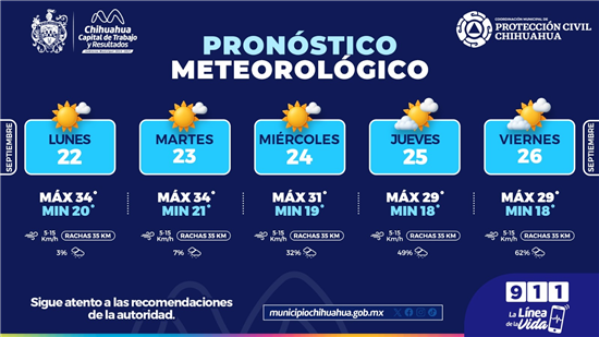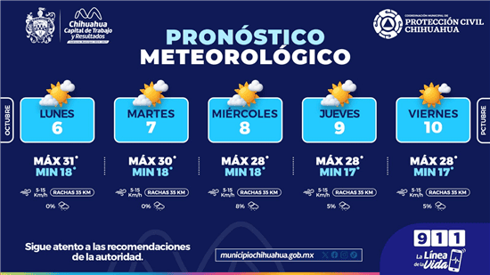 La Coordinación de Protección Civil de Chihuahua informa sobre las condiciones climáticas para la semana, con temperaturas cálidas y probabilidad de lluvias ligeras.