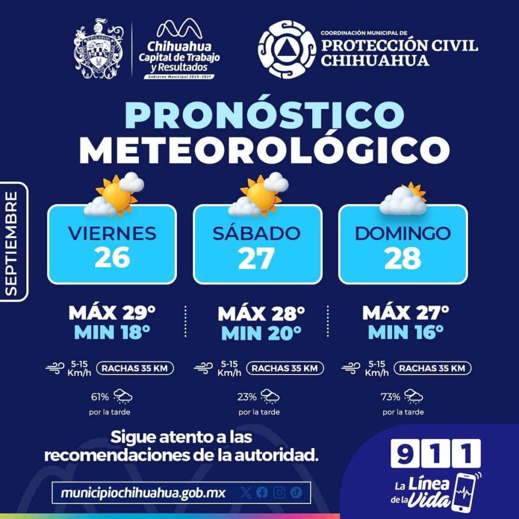 El Gobierno Municipal de Chihuahua advierte sobre lluvias y condiciones meteorológicas para el fin de semana, con temperaturas que varían entre 16°C y 29°C.