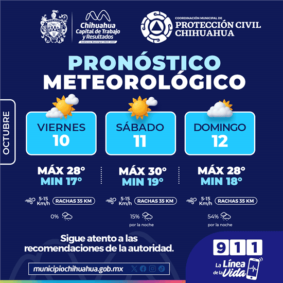 El Gobierno Municipal de Chihuahua advierte sobre la probabilidad de lluvias y cielos parcialmente nublados para este domingo, con climas más estables el viernes y sábado.
