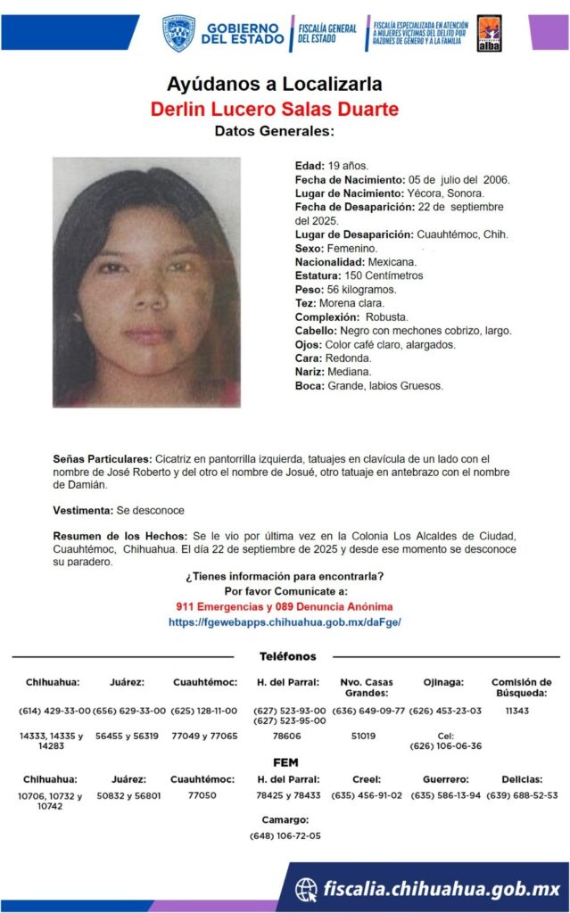 Derlin Lucero Salas Duarte, de 19 años, desapareció el 22 de septiembre en Cuauhtémoc, Chihuahua. Se solicita la colaboración de la ciudadanía para su localización.