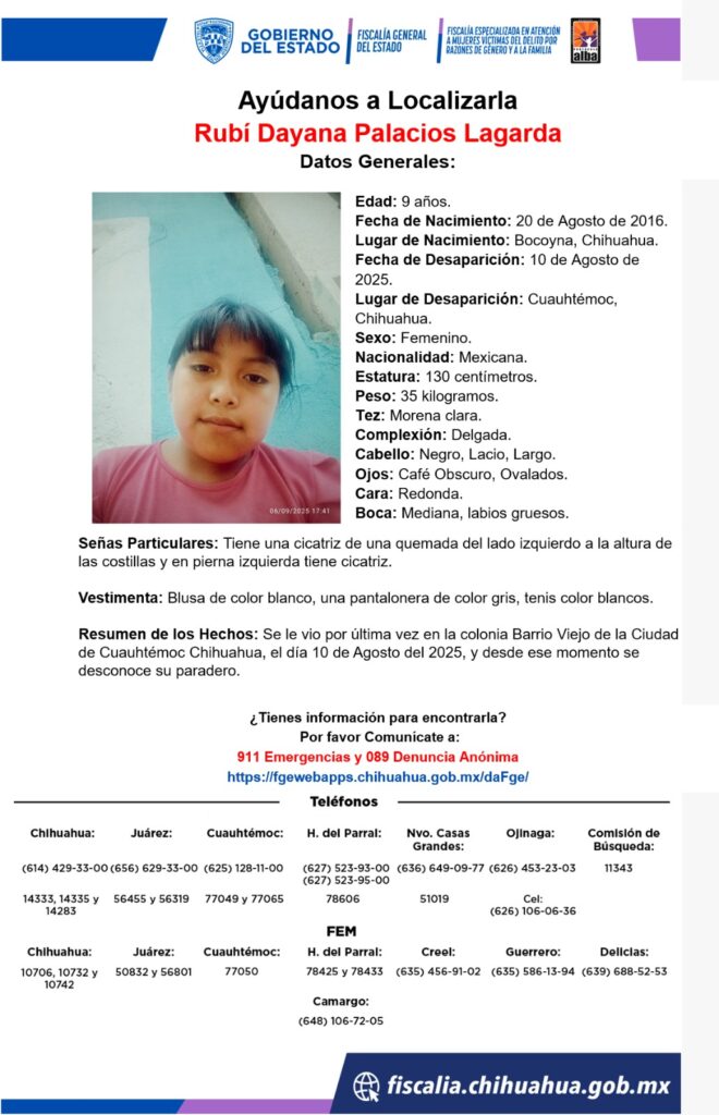 Rubí Dayana Palacios Lagarda, de 9 años, desapareció en Cuauhtémoc, Chihuahua. Se solicita la colaboración de la comunidad para localizarla. Cualquier información es valiosa.