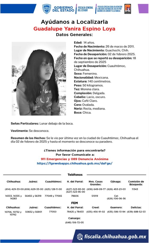 Guadalupe Yanira Espino Loya, de 14 años, desapareció en Cuauhtémoc, Chihuahua. Se solicita la colaboración de la ciudadanía para encontrarla. Cualquier información es valiosa.