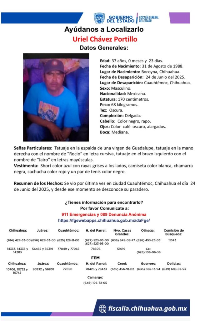 Se busca a Uriel Chávez Portillo, desaparecido desde el 24 de junio de 2025 en Cuauhtémoc, Chihuahua. Se solicita la colaboración de la ciudadanía para obtener información sobre su paradero.