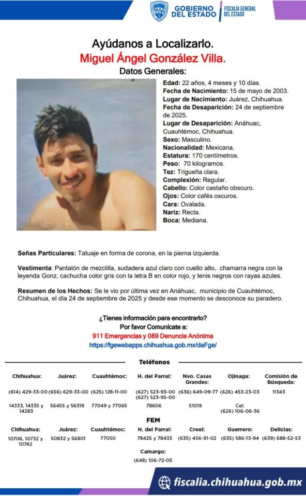 Miguel Ángel González Villa, de 22 años, desapareció el 24 de septiembre de 2025 en Anáhuac, Cuauhtémoc, Chihuahua. Se solicita apoyo para encontrarlo.