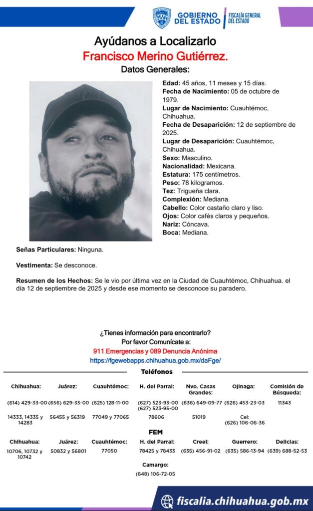 Se solicita apoyo para localizar a Francisco Merino Gutiérrez, desaparecido en Cuauhtémoc, Chihuahua, desde el 12 de septiembre de 2025. Cualquier información es valiosa.