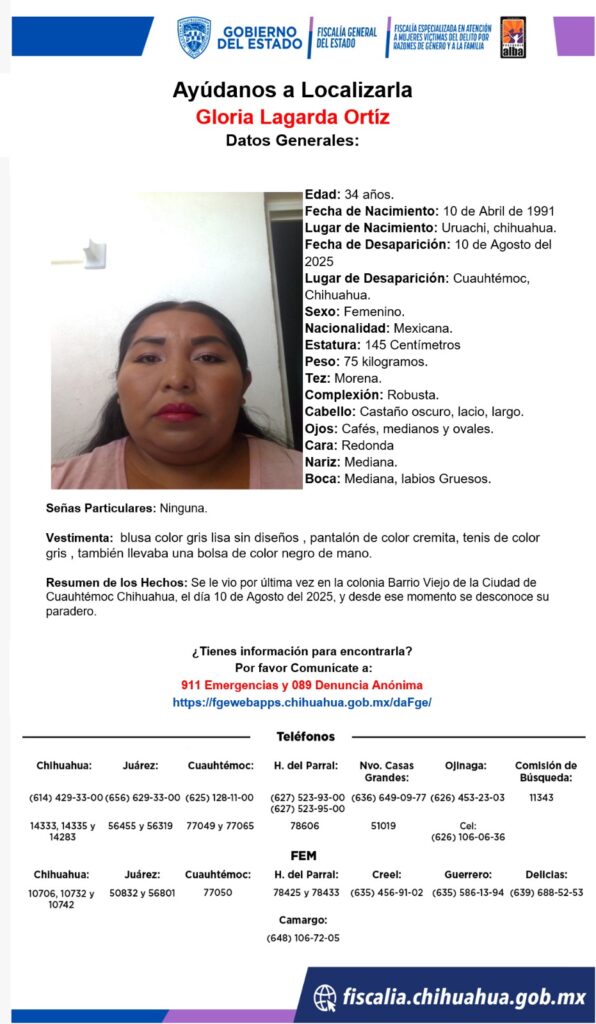 Gloria Lagarda Ortíz, de 34 años, desapareció el 10 de agosto de 2025 en Cuauhtémoc, Chihuahua. Se solicita la colaboración de la ciudadanía para su localización.