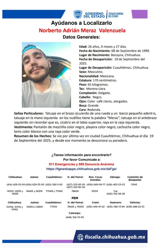 Norberto Adrián Meraz Valenzuela, de 26 años, desapareció en Cuauhtémoc, Chihuahua. Se solicita la colaboración de la comunidad para su localización.