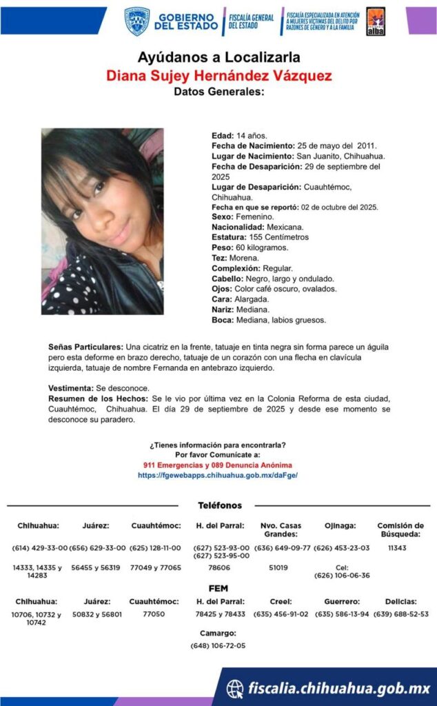 La Fiscalía General del Estado busca a Diana Sujey Hernández, una adolescente de 14 años desaparecida en Cuauhtémoc, Chihuahua, desde el 29 de septiembre de 2025. Se solicita la colaboración de la ciudadanía.