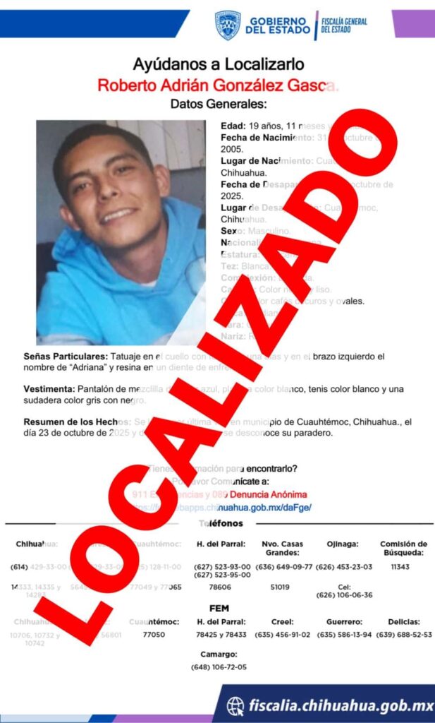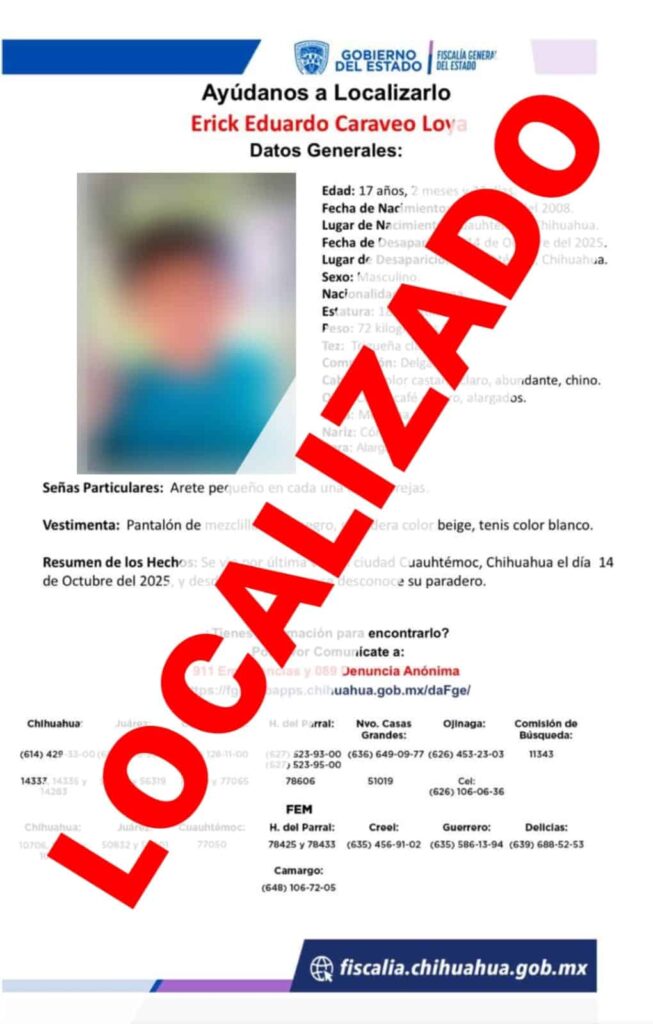 La Fiscalía de Distrito Zona Occidente confirmó la localización del menor E. E. C. L., de 17 años, quien había sido reportado como desaparecido en Cuauhtémoc, Chihuahua.