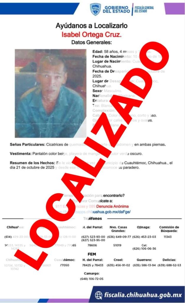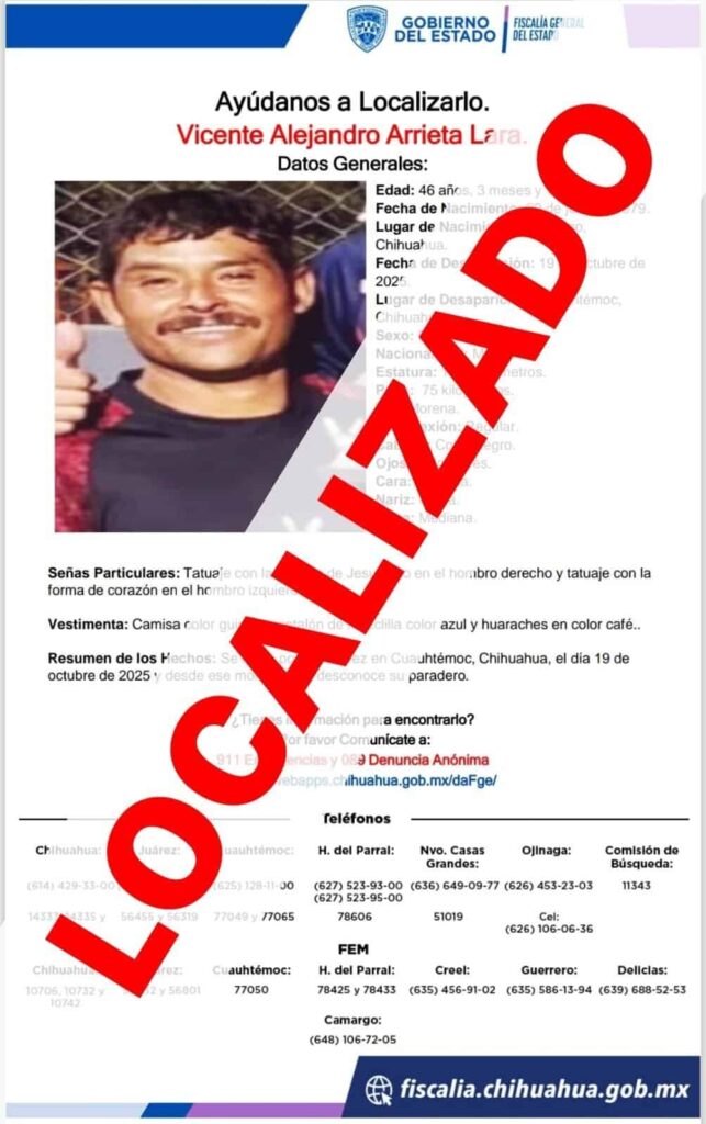 La Fiscalía de Distrito Zona Occidente encontró a Vicente Alejandro A. L., reportado como desaparecido el 19 de octubre en Cuauhtémoc. El hombre declaró que se ausentó por su voluntad.