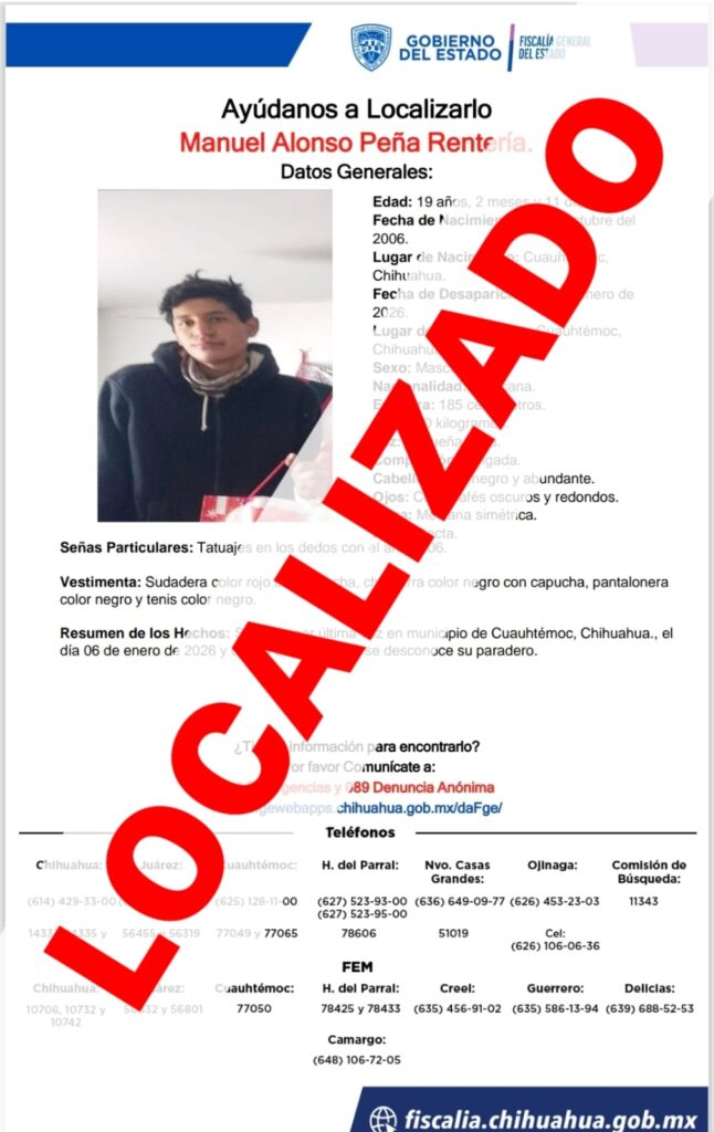 La Fiscalía de Distrito Zona Occidente localizó sano y salvo a un adolescente de 14 años que había estado ausente desde el 1 de diciembre en Cuauhtémoc, Chihuahua.