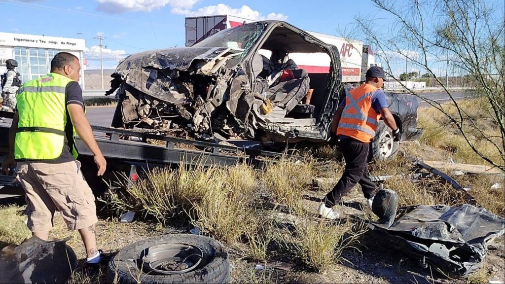 DELICIAS, Chih.– Una pick-up negra quedó volcada e incendiada sobre la carretera federal número 45, lo que movilizó a cuerpos de rescate y autoridades luego de que el conductor permaneciera atrapado entre los fierros retorcidos, sin posibilidad de salir por sus propios medios. El reporte ingresó al sistema de emergencias 911 señalando además un derrame […]