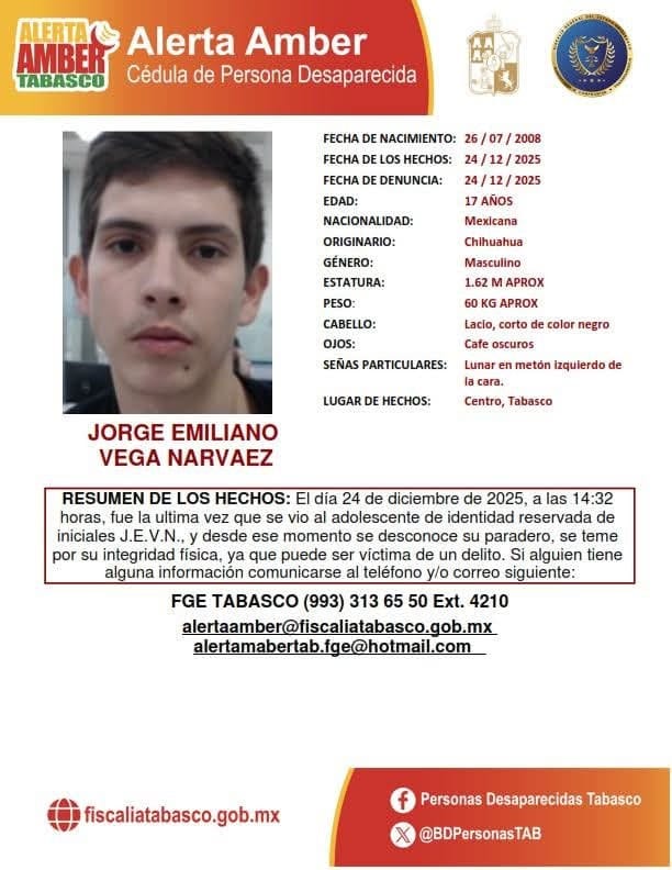 Un joven de 17 años de Chihuahua desapareció en Tabasco junto a cinco menores. Las autoridades han activado la Alerta Amber para su búsqueda.