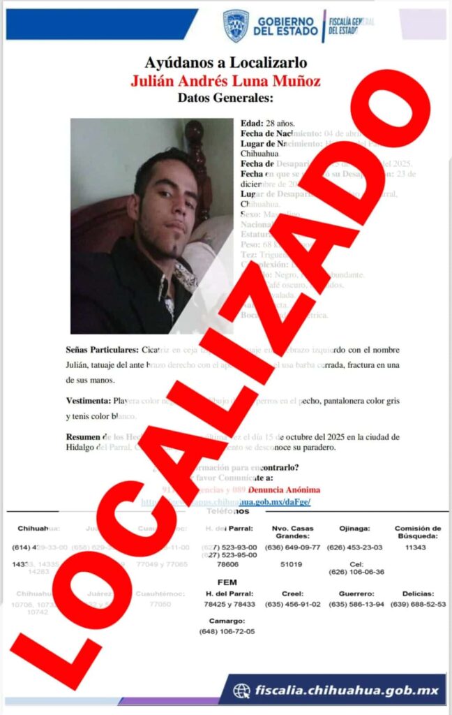 La Fiscalía de Distrito Zona Sur localizó a Carlos Eduardo M. G. en Parral, tras ser reportado como desaparecido. Su ausencia fue voluntaria, según declaró.