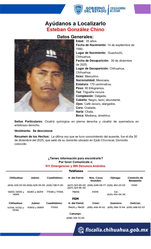 Esteban González Chino ha sido reportado como desaparecido en Chihuahua. Las autoridades están llevando a cabo investigaciones para dar con su paradero.