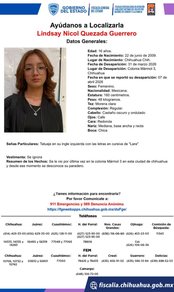 Lindsay Nicol Quezada Guerrero, de 16 años, desapareció el 31 de marzo de 2026 en la colonia Mármol 3 en Chihuahua. Se solicita información para dar con su paradero.