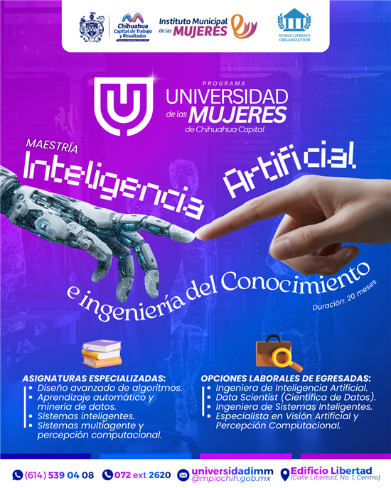 El Gobierno Municipal de Chihuahua invita a mujeres a inscribirse en la maestría en Inteligencia Artificial en la Universidad de las Mujeres, buscando fomentar su participación en tecnología.