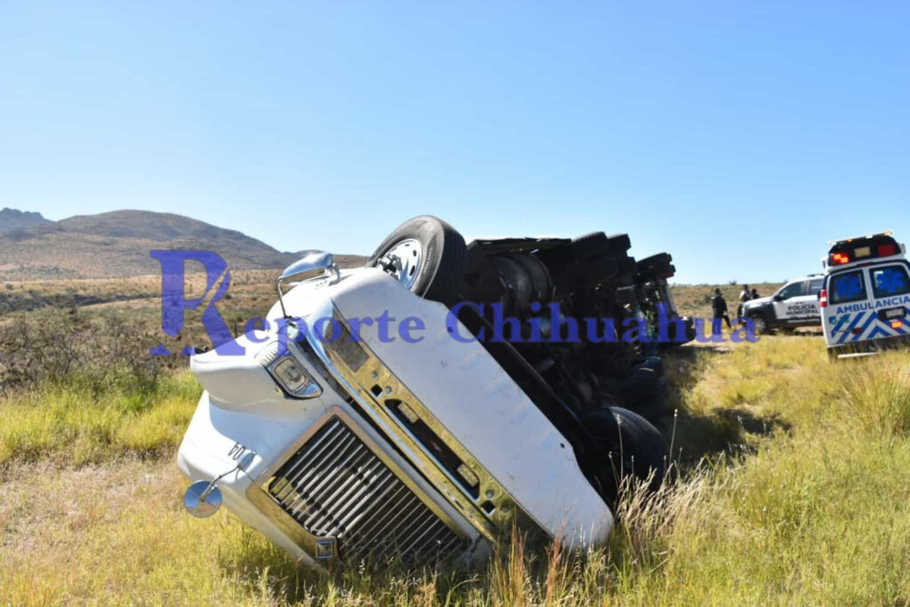 Un tráiler de Transportes Sonia volcó esta tarde en las Curvas del Perico, Chihuahua. El conductor fue atendido por paramédicos en el lugar del accidente.