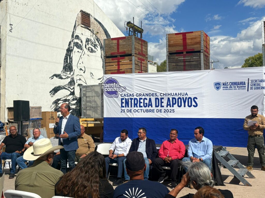 El Gobierno del Estado entrega apoyos a 174 familias afectadas por lluvias en Casas Grandes, incluyendo enseres domésticos y artículos esenciales para su recuperación.