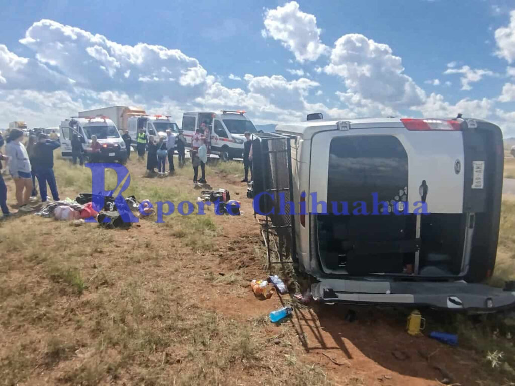 Una camioneta Ford Transit volcó en la carretera Chihuahua-Juárez con estudiantes a bordo. Un menor fue trasladado al hospital, mientras otros 23 recibieron atención en el lugar.