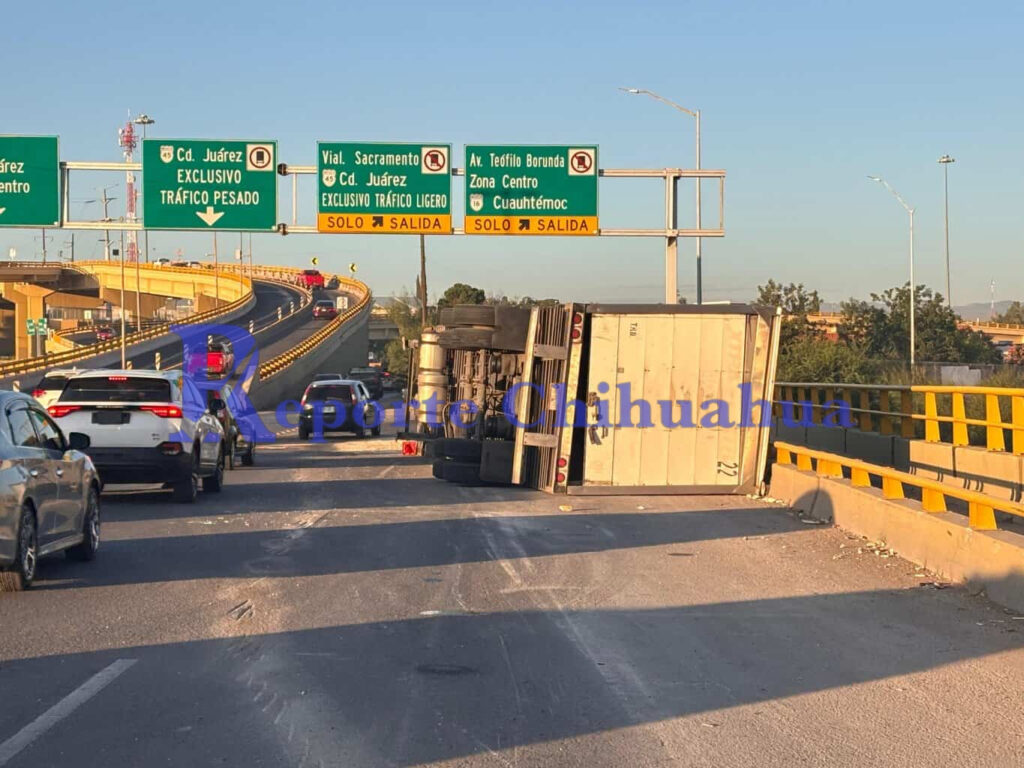 Un tráiler que transportaba carne volcó en la carretera Aldama-Chihuahua. El chofer perdió el control al tomar una curva, pero no se reportaron lesionados.
