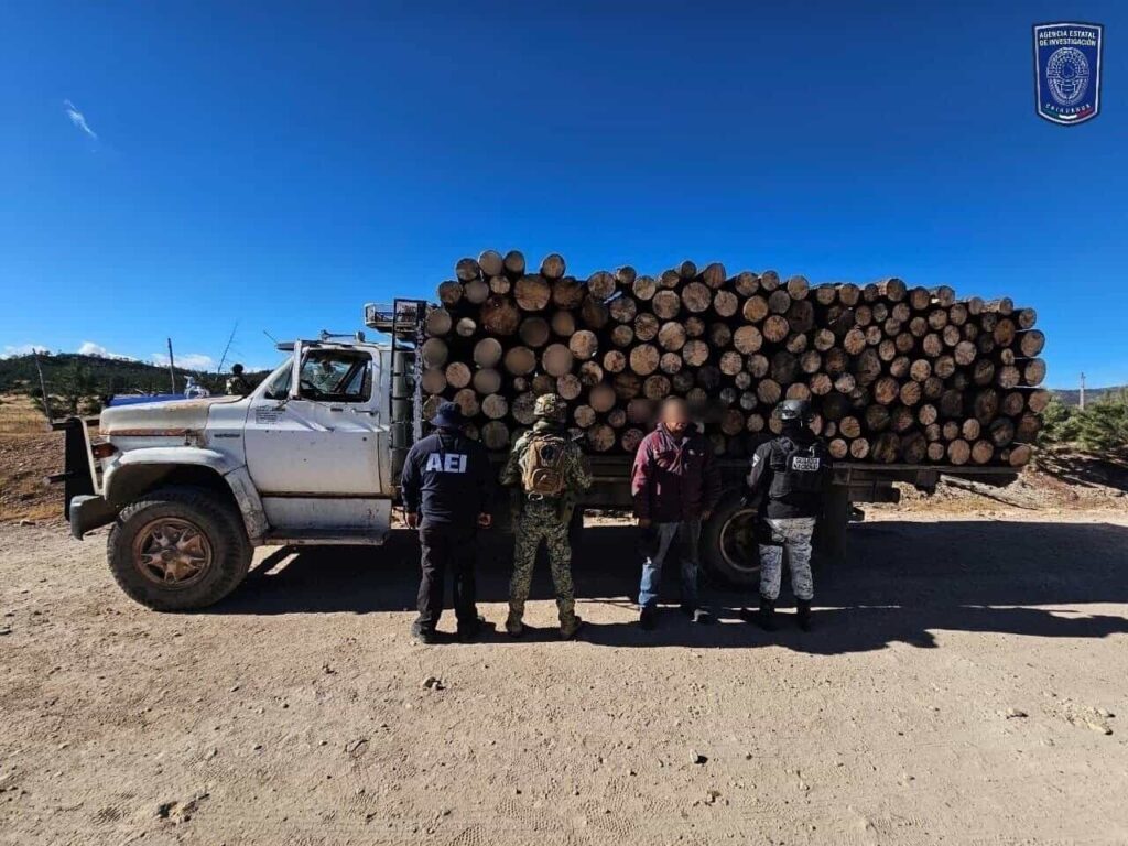 La SSPE, junto a la Guardia Nacional, asegura un tractocamión con 158 trozos de madera sin documentación en Guachochi. El conductor fue detenido por delitos ambientales.