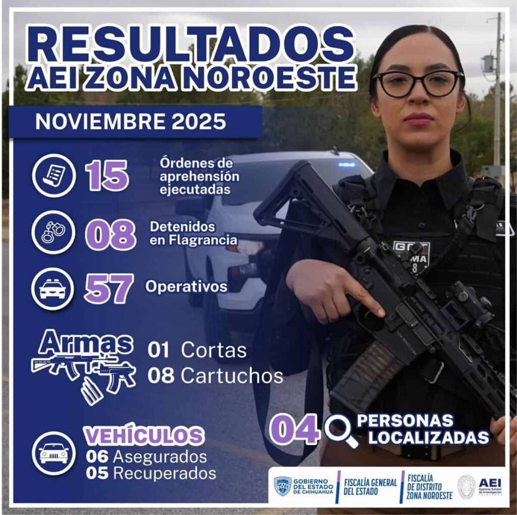 La Agencia Estatal de Investigación reporta 15 órdenes de aprehensión y 8 detenciones en flagrancia durante noviembre, además de operativos que localizaron personas desaparecidas.