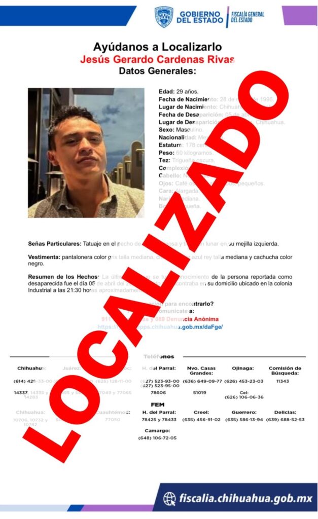 La Fiscalía de Distrito Zona Centro encontró sano y salvo a Jesús B. D., quien había sido reportado como ausente desde el 17 de marzo en Chihuahua.