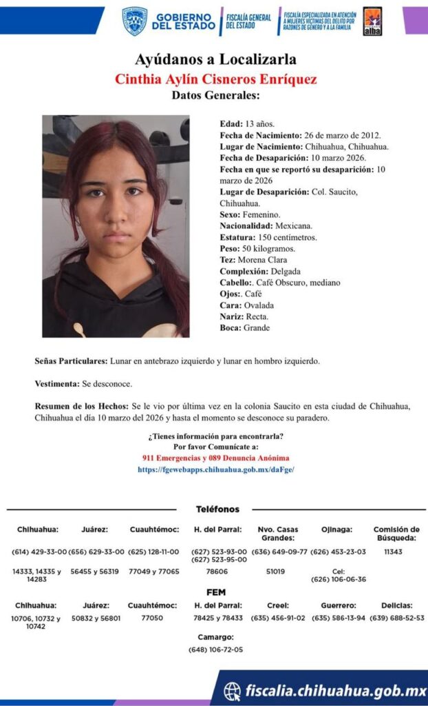 Cinthia Aylín Cisneros Enríquez, una niña de 13 años, fue reportada como desaparecida el pasado 10 de marzo de 2026. La última vez que fue vista, se encontraba en la colonia Saucito, en la ciudad de Chihuahua.