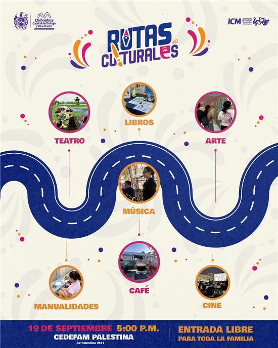 El Gobierno Municipal de Chihuahua invita a la comunidad a participar en Rutas Culturales, una jornada de actividades artísticas y recreativas el 19 de septiembre en el CEDEFAM Palestina.