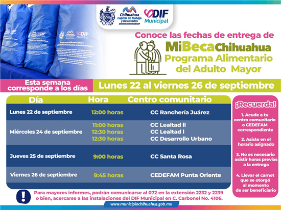 El Gobierno Municipal de Chihuahua informa sobre la entrega del Programa Alimentario del Adulto Mayor (PAAM) del 22 al 26 de septiembre en varios centros comunitarios.