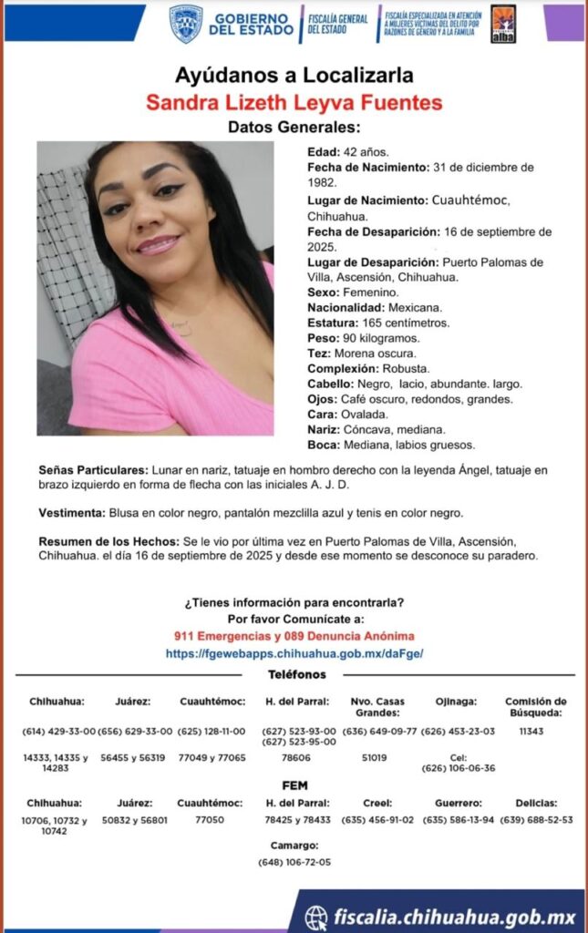 Sandra Lizeth Leyva Fuentes, de 42 años, desapareció el 16 de septiembre de 2025 en Puerto Palomas de Villa, Ascensión, Chihuahua. Se solicita apoyo para su localización.