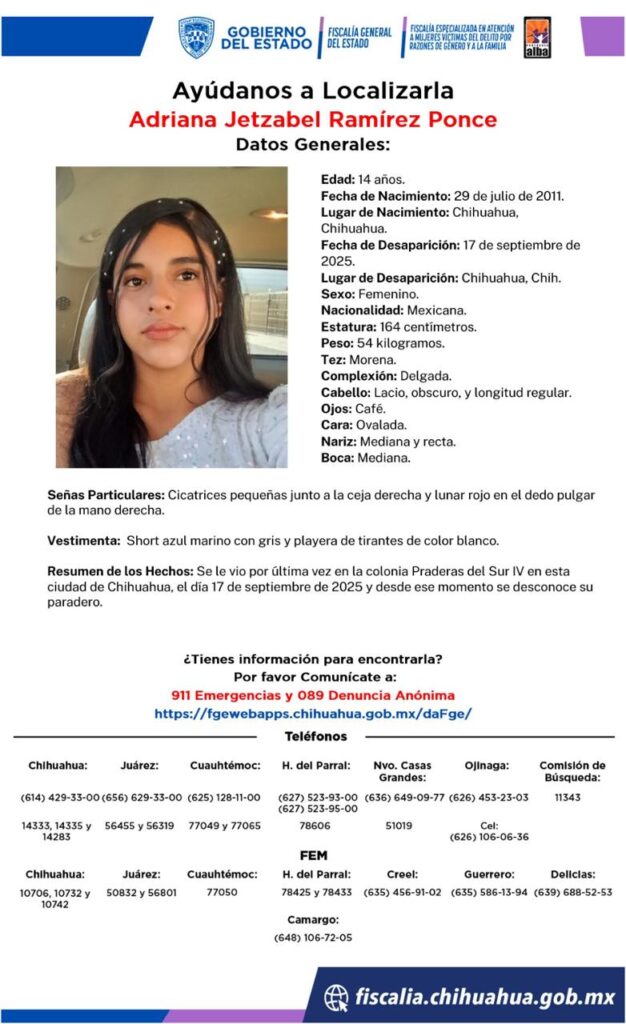 Adriana Jetzabel Ramírez Ponce, de 14 años, desapareció en Chihuahua el 17 de septiembre de 2025. Se solicita la colaboración de la ciudadanía para localizarla.