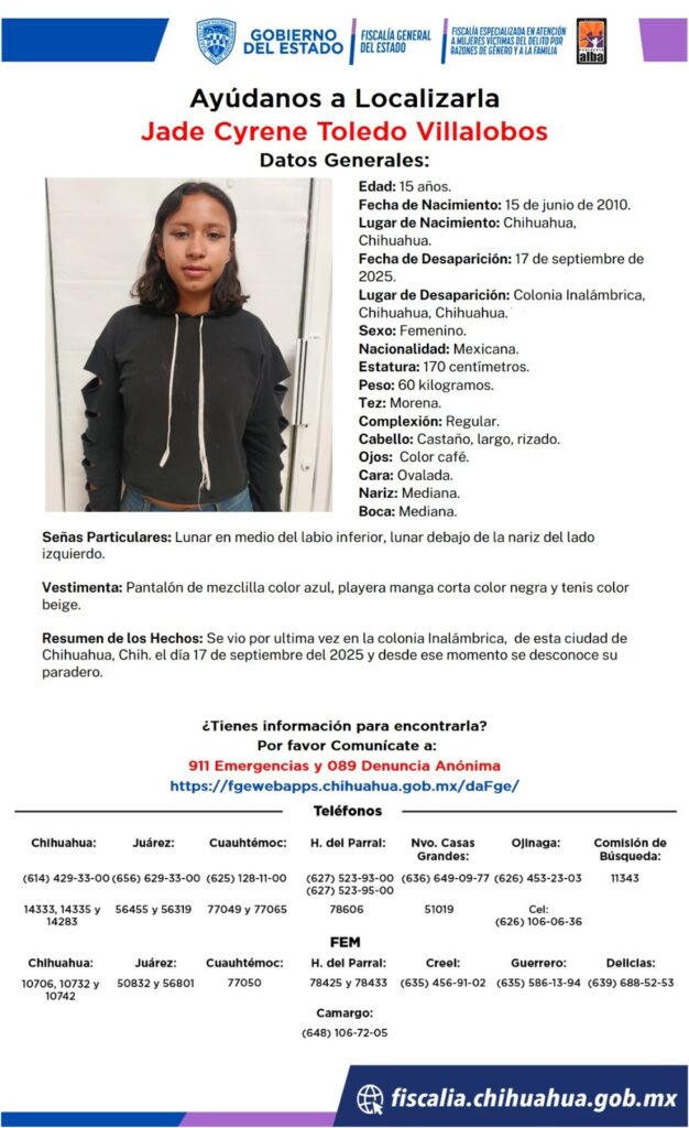 Jade Cyrene Toledo Villalobos, de 15 años, desapareció el 17 de septiembre de 2025 en Chihuahua. Se solicita la colaboración de la ciudadanía para encontrarla.