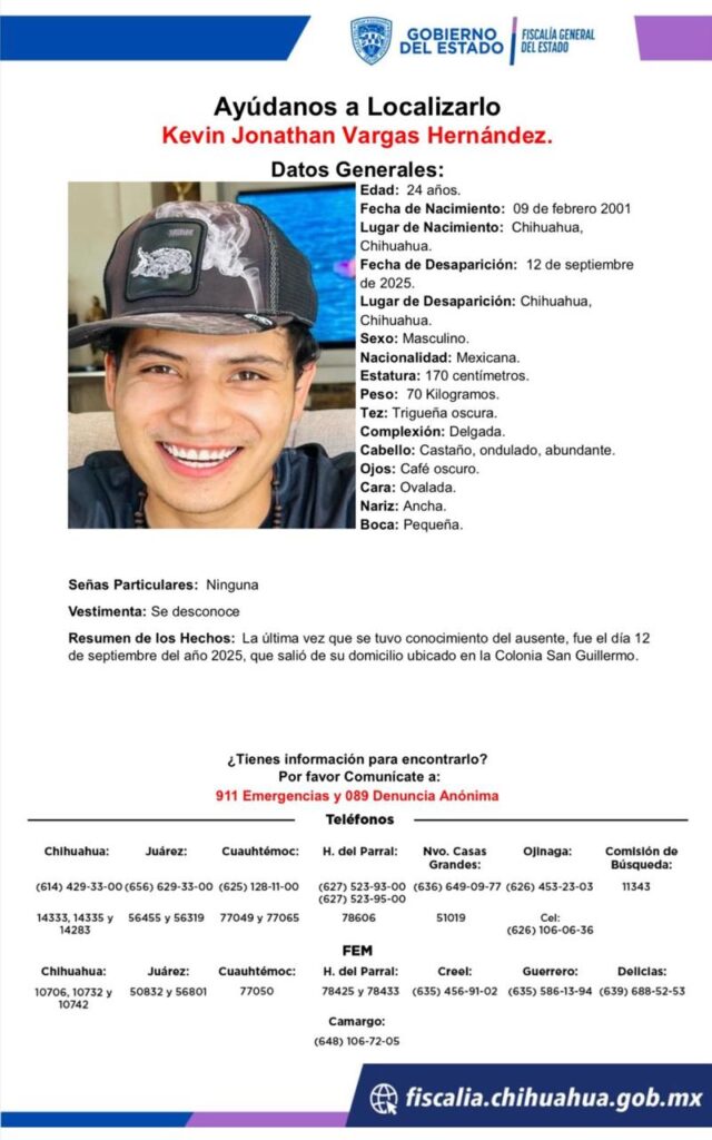 Kevin Jonathan Vargas Hernández, de 24 años, desapareció el 12 de septiembre de 2025 en Chihuahua. Se solicita la colaboración de la comunidad para su localización.