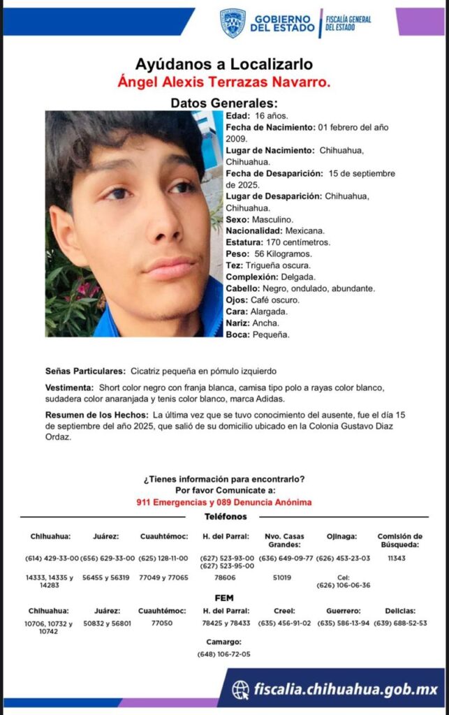 Se solicita apoyo para localizar a Ángel Alexis Terrazas Navarro, desaparecido desde el 15 de septiembre de 2025 en Chihuahua. Se ofrecen números de contacto para cualquier información.