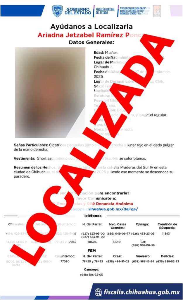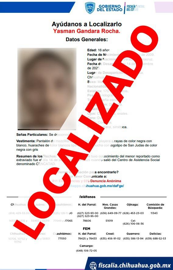 La Fiscalía de Distrito Zona Centro localizó a Daylen Yaneth C. S., de 21 años, quien había sido reportada como ausente desde el 26 de septiembre en Chihuahua. Se encuentra sana y salva.