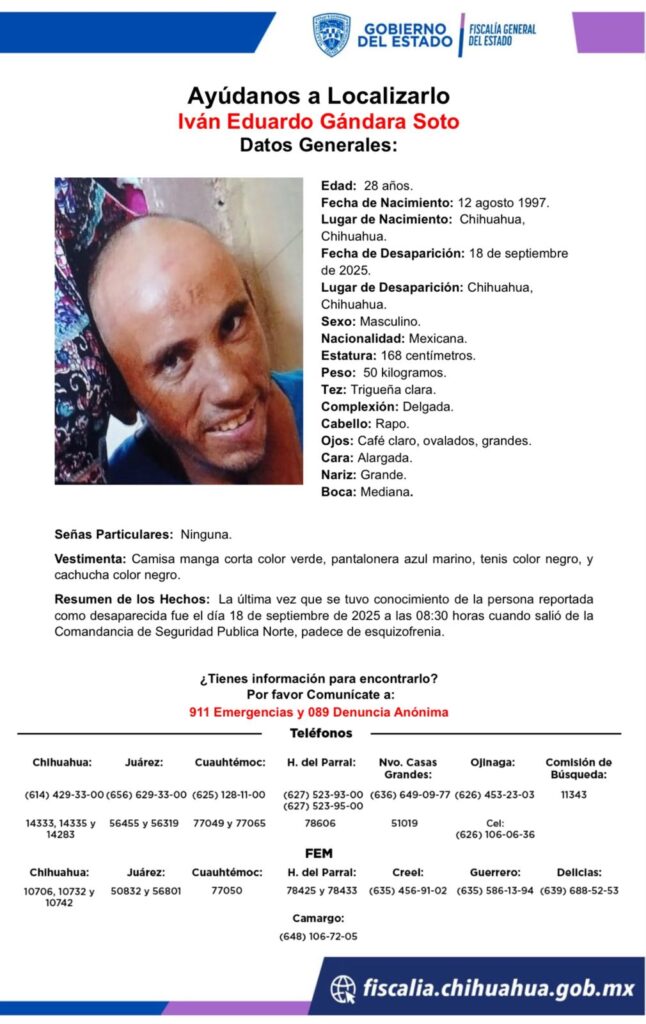 Iván Eduardo Gándara Soto, de 28 años, desapareció el 18 de septiembre de 2025 en Chihuahua. Se solicita la colaboración de la ciudadanía para su búsqueda.