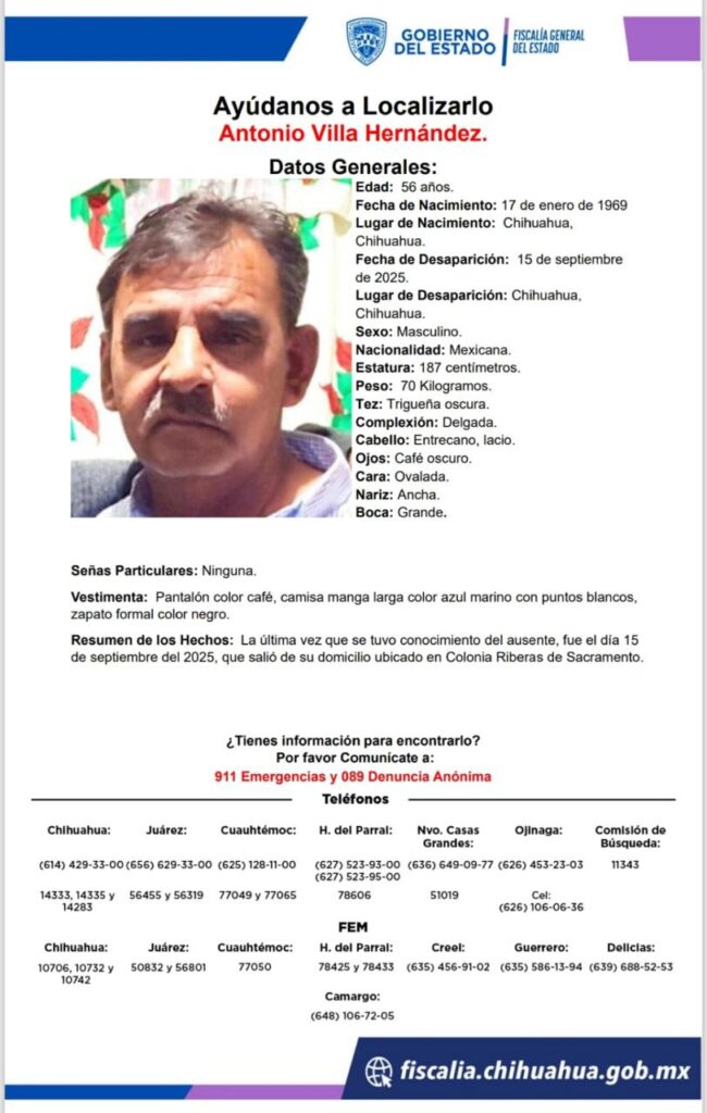 Antonio Villa Hernández, de 56 años, desapareció el 15 de septiembre de 2025 en Chihuahua. Se solicita la colaboración de la ciudadanía para su localización.