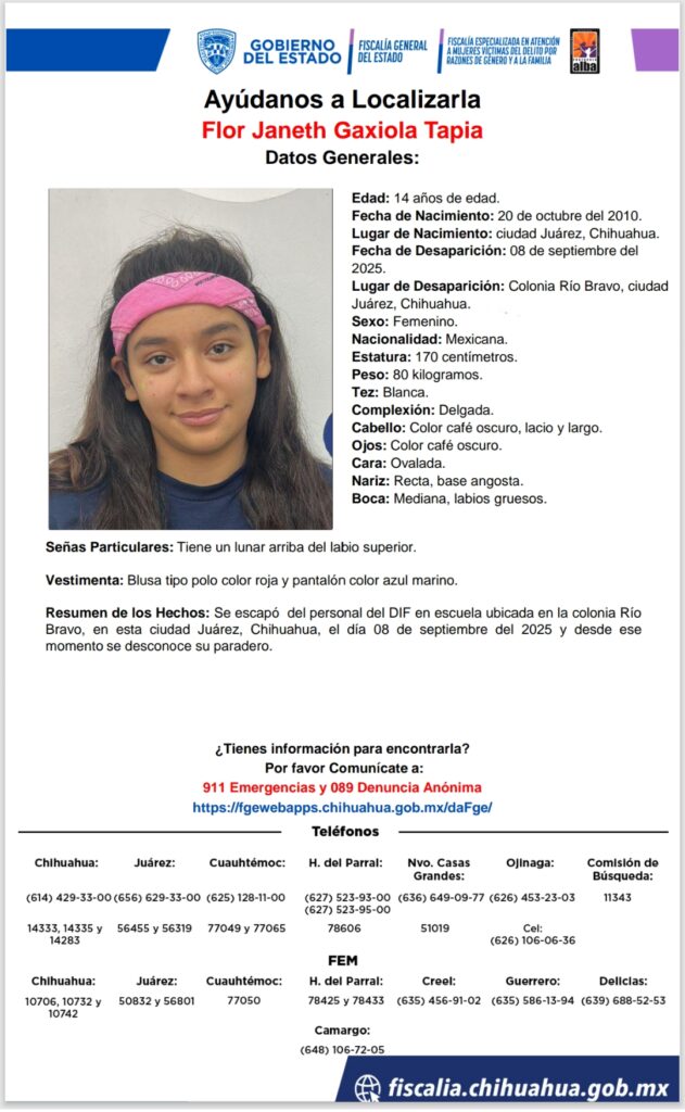 Flor Janeth Gaxiola Tapia, de 14 años, desapareció en Ciudad Juárez. Se solicita la colaboración de la población para localizarla tras escapar del DIF.