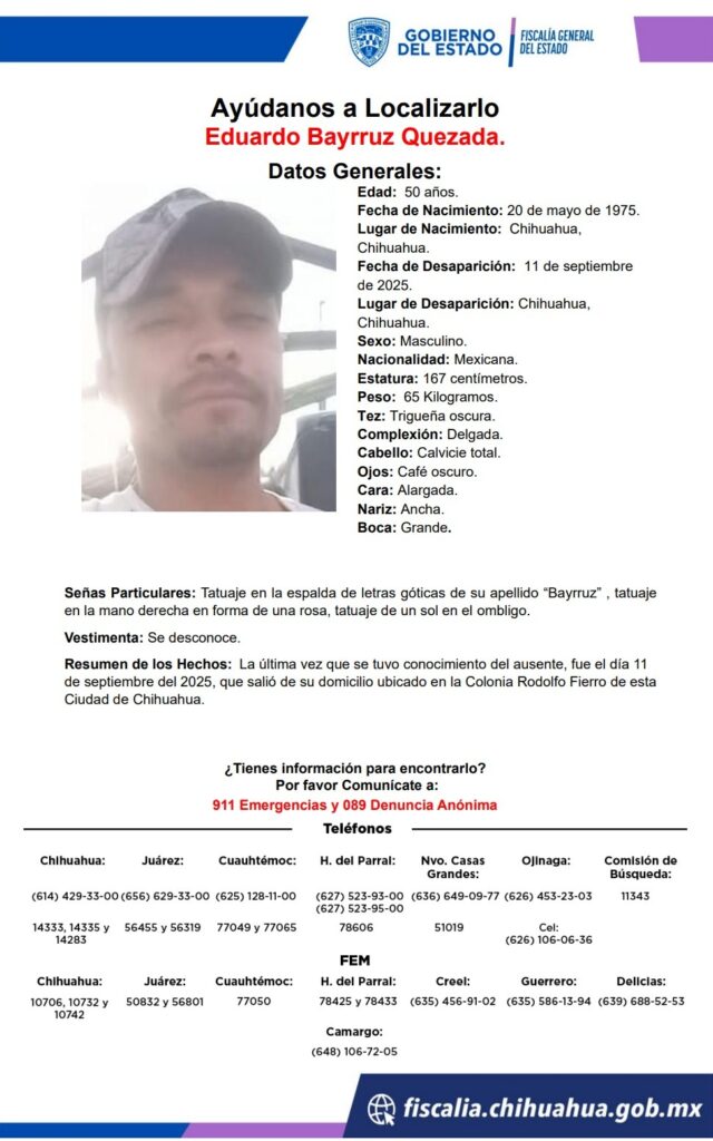 Se solicita apoyo para encontrar a Eduardo Bayrruz Quezada, desaparecido desde el 11 de septiembre de 2025 en Chihuahua. Cualquier información es valiosa.