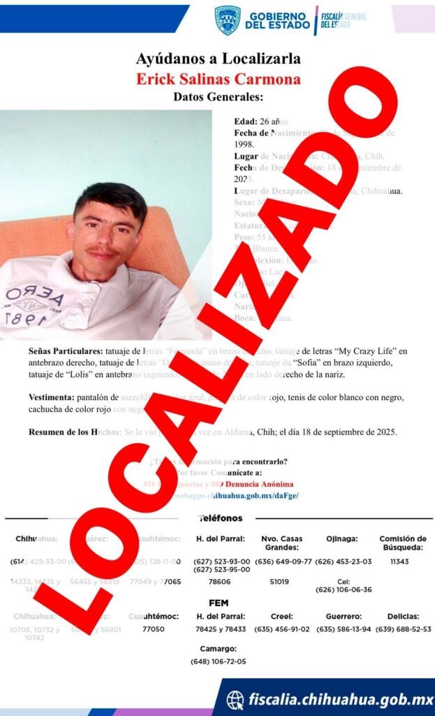 La Fiscalía de Distrito Zona Centro encontró a Erick S. C., de 26 años, quien había sido reportado como ausente. Se encontraba sano y salvo en un rancho donde trabajaba.