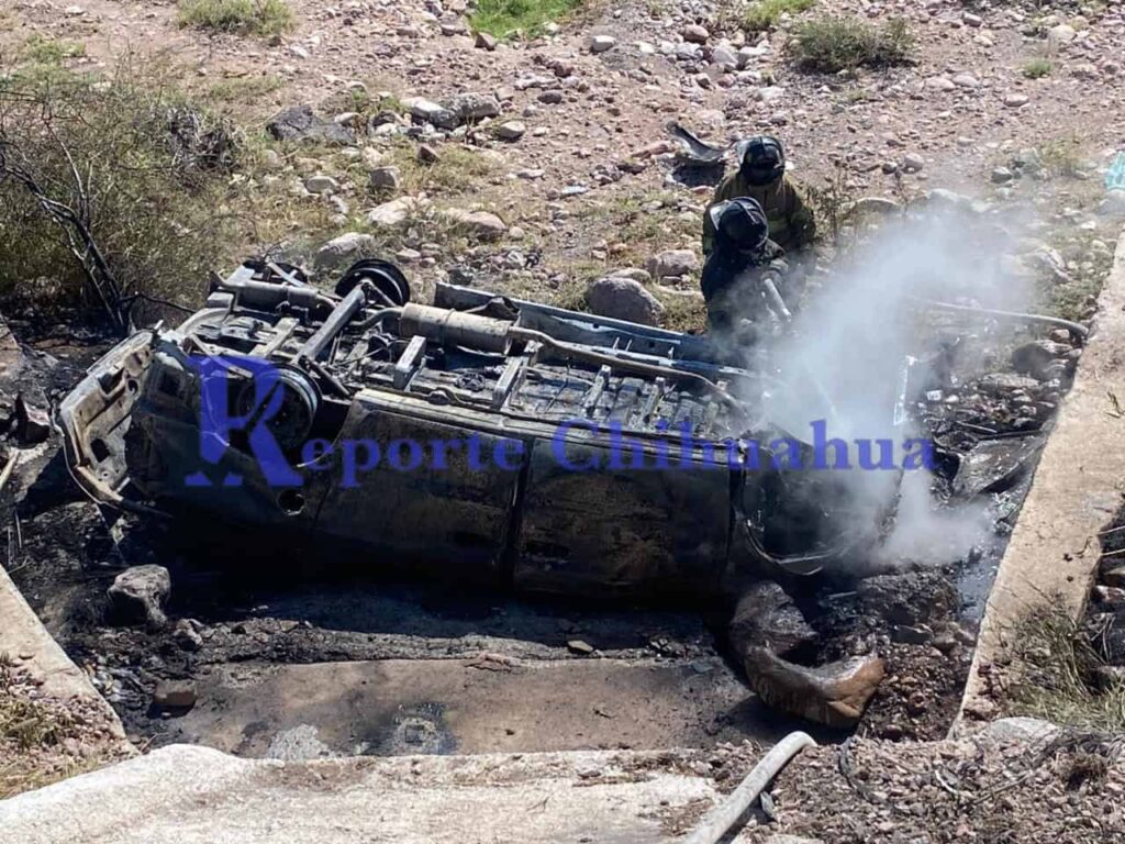 Un joven de 24 años perdió el control de su camioneta en la carretera Delicias-Chihuahua, cayendo a un barranco y provocando un incendio. Fue atendido por paramédicos.