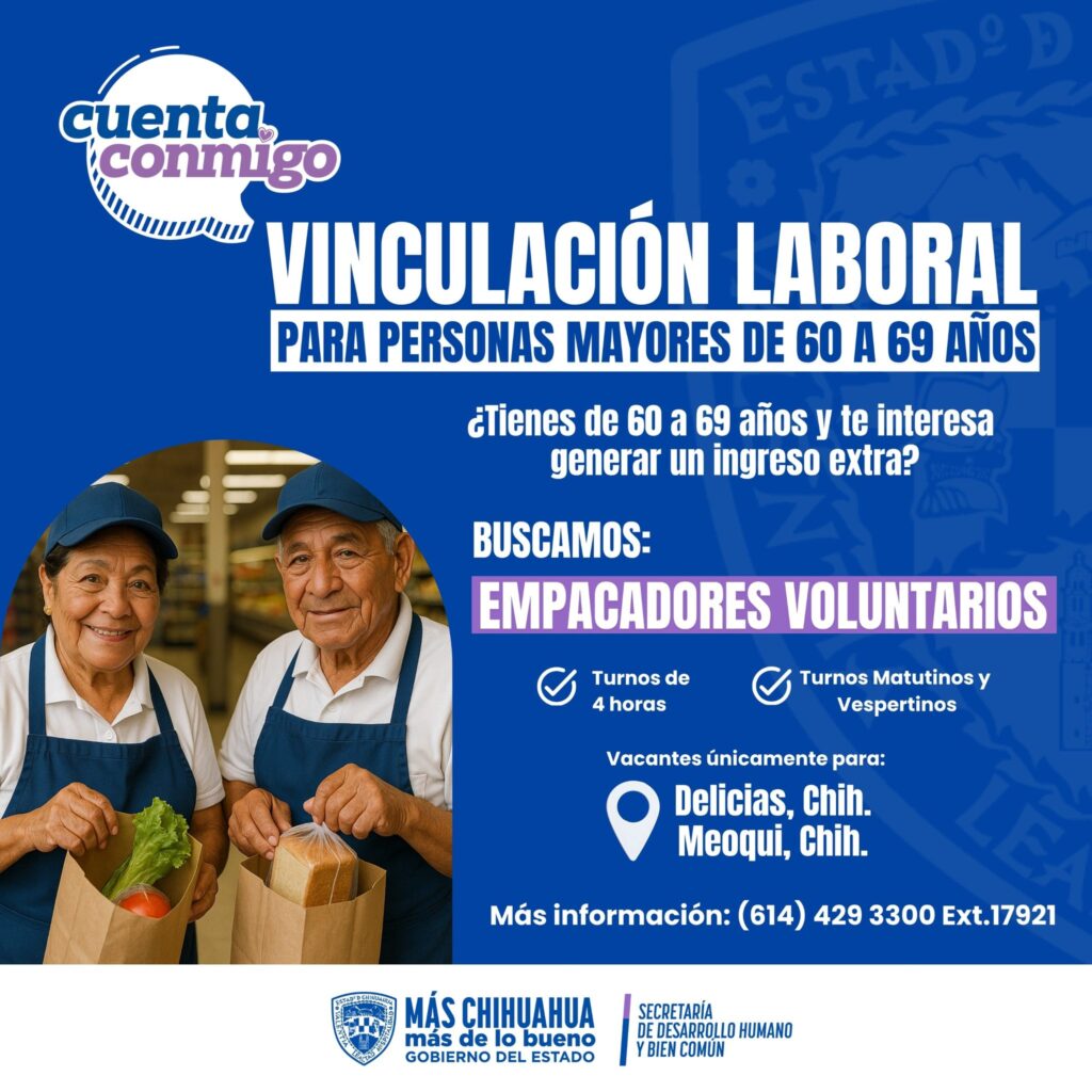 El Gobierno del Estado abre vacantes para empacadores voluntarios de 60 a 69 años en Delicias y Meoqui, ofreciendo ingresos y actividad social.
