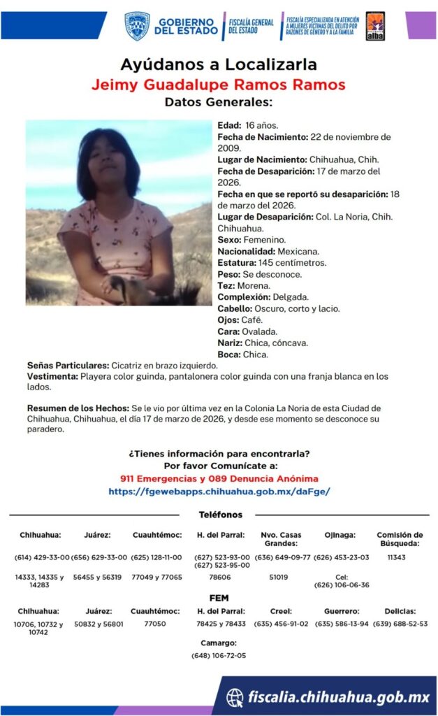 Jeimy Guadalupe Ramos, de 16 años, fue vista por última vez el 17 de marzo de 2026 en la Colonia La Noria de Chihuahua. Desde entonces, se desconoce su paradero.