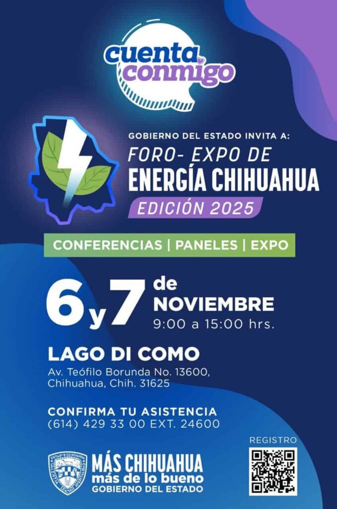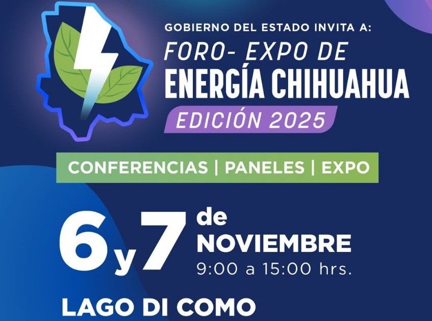 El Gobierno del Estado invita al Foro-Expo de Energía Chihuahua 2025, que se llevará a cabo el 6 y 7 de noviembre en la capital, con entrada gratuita y diversas actividades para profesionales del sector.